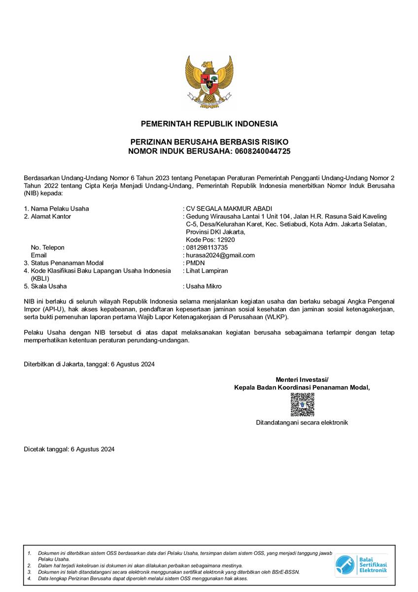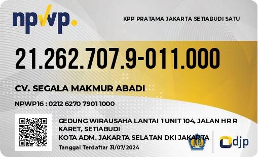 CV. Segala Makmur Abadi merupakan Perusahaan yang bergerak dibidang Penyedia Barang dan Jasa Penunjang Operasional Perusahaan dengan konsep One Stop Service meliputi : IT Solution & Office Needs (Infrastructure Solution, Business Application, Profesional Services), Desain Interior, Pengadaan Alat Tulis Kantor (ATK) & Alat Elektronik, Corporate Apparel & Merchandise dan kebutuhan Chemical.